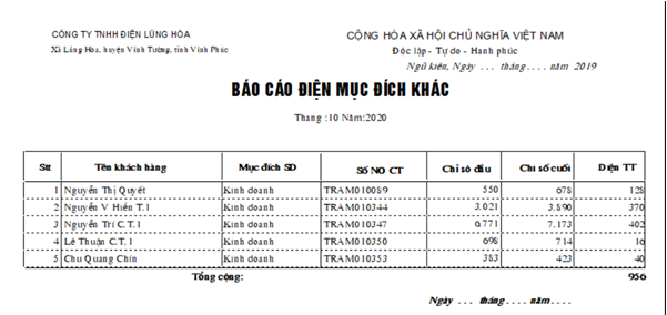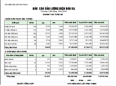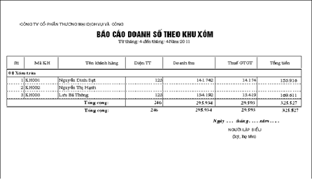 Thiết lập các báo cáo tổng hợp hay chi tiết tình hình sử dụng điện theo khu xóm, trạm biến áp, nhân viên thu tiền…